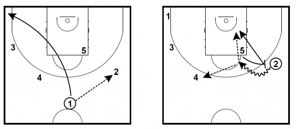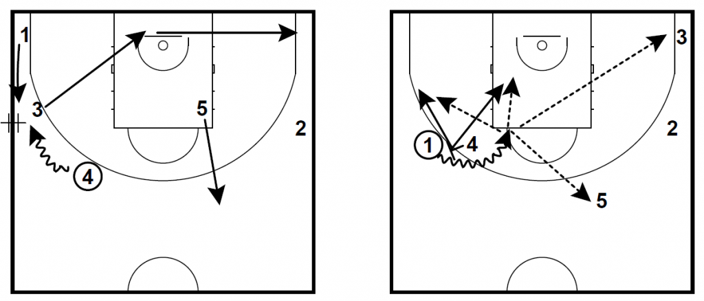 講義では、Side to Side PnRとして、下図のオフェンス戦術を紹介した。