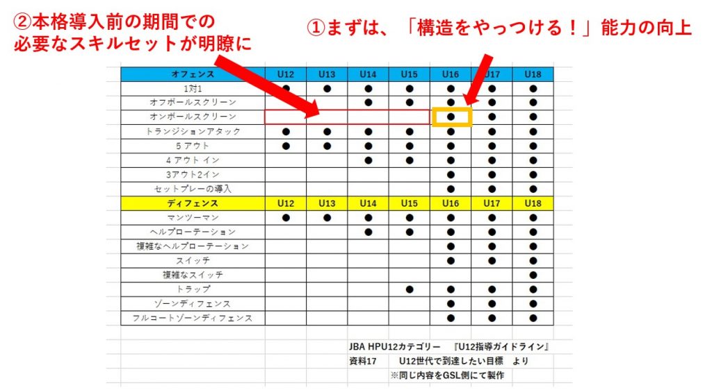 ②JBAが提唱している年代別カリキュラムを踏まえ、U16、U18世代で大切な事
