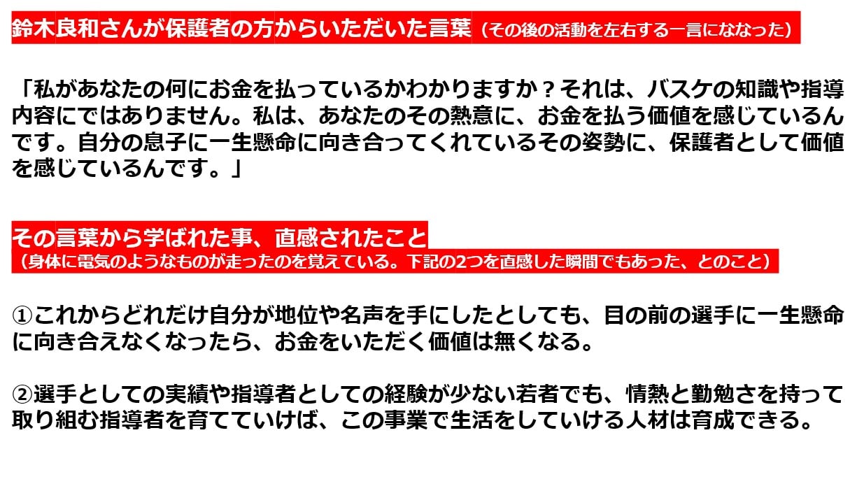 ・大学院時代に、アルバイトで勉強の家庭教師をしようと考えた。勉強の家庭教師があるのなら、バスケットボールにも家庭教師があっても良いと考え、HPに記載をした。