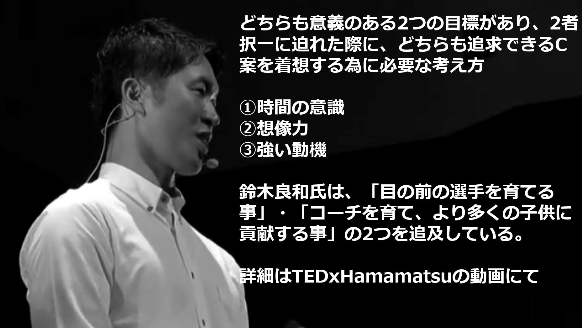 2018年にはTEDxHamamatsuに鈴木良和氏が登壇。ご自身の事業を通じて得られた学びは『どちらも魅力のある二択で迷った際に、両方を実現する為の考え方』として明瞭な言葉で整理され、約20分近い講演の中、見事なプレゼンテーションで、その哲学が語られている。
