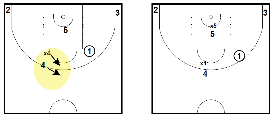 ※X4の選手がDiveをする5番の選手へのHelpへの意識を薄め、ポップアウトへのマークを強調する事で、当然、5へのアシストパスのチャンスは増えた。学生チームの目標としては、5への安易なパスを出させない、かつ、ポップアウトもフリーにしない事。コーナーへのスキップパスをケアしながらX2のヘルプ、またはX5とX1のスイッチなども織り交ぜ、絶妙な間合いやタイミングでディフェンスを改善してきた。本稿では、ペイントエリアでの攻防における詳しい説明は図解は割愛する。
