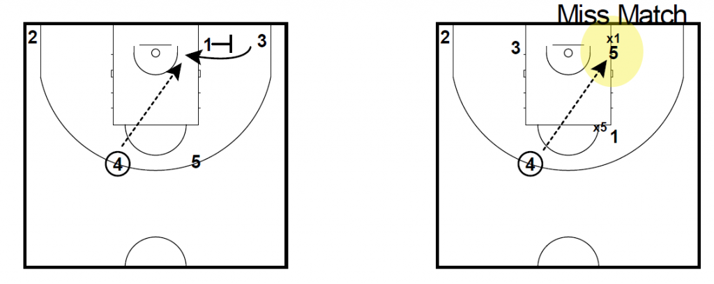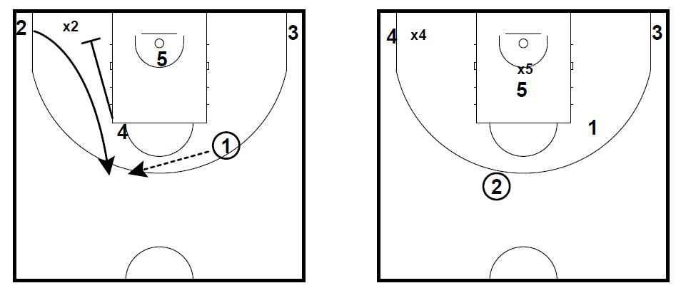 • ①が台形付近でボールをレシーブしてミドルシュート、またはハンドオフからの2on2へと移行