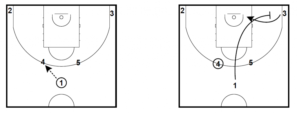 • 反対サイドのウィングの選手へスクリーンをセットし、ボールサイドカット。そこに対してダウンスクリーンをセット